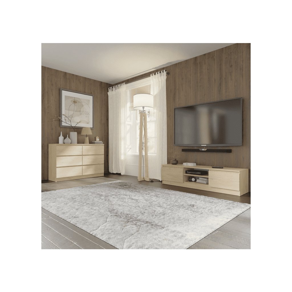 A divatos és praktikus MAJA TV-állvány minimalista szettakra és lenyűgöző részletekre épül. Az asztal nyitott polcokkal rendelkezik, így két ajtója rengeteg tárolóhelyet rejt. Egyszerű kialakításának és népszerű cremonai tölgyfa dekorációjának köszönhetően a TV-állvány bármilyen enteriőrbe illik .