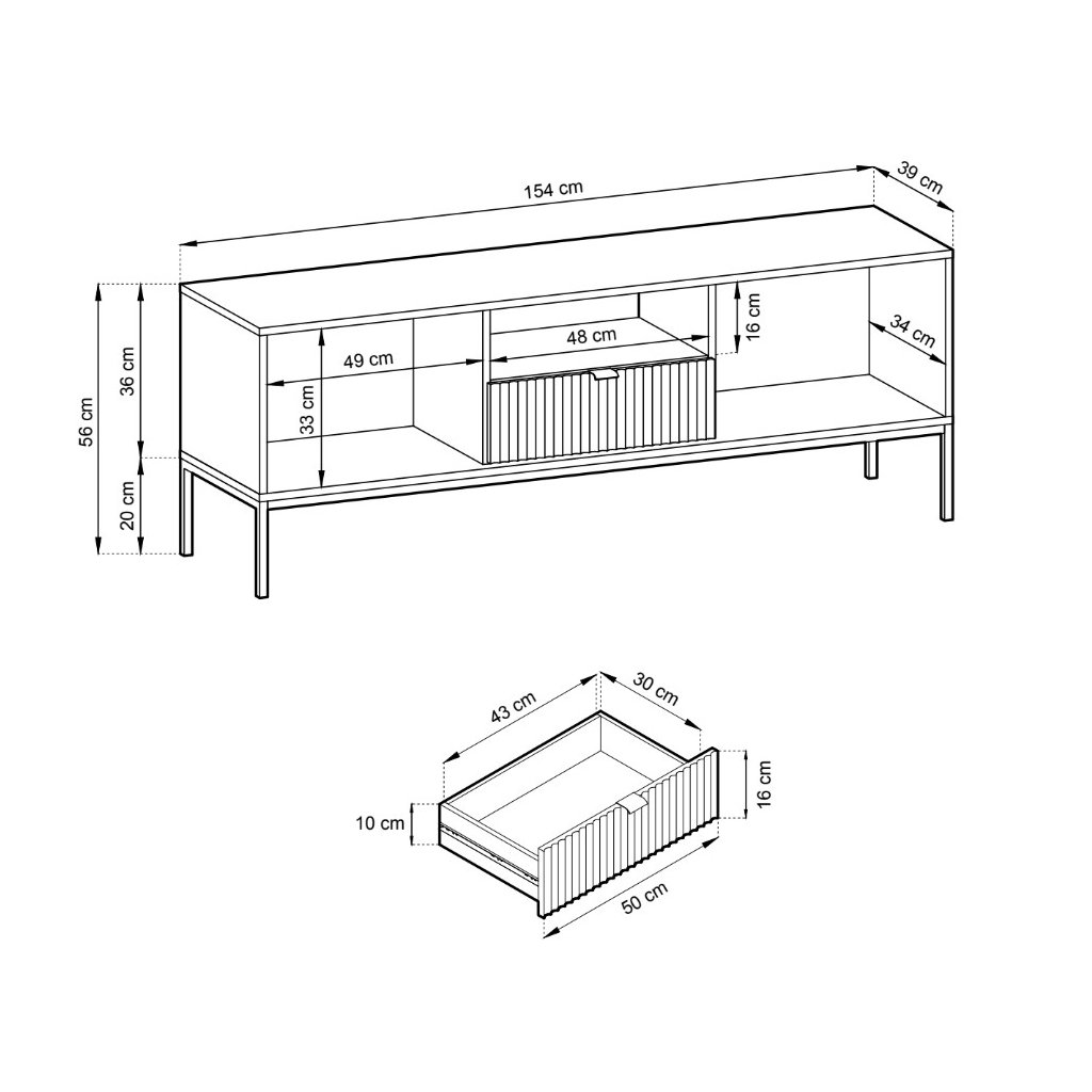 A MONA RTV-154 TV-állvány 16 mm-es laminált anyagból , az ajtók és fiókok pedig 18 mm-es MDF-ből készültek. A magasabb fekete fém lábak tökéletes kontrasztot alkotnak az arany fogantyúkkal. Az ABS élek természetesen jelen vannak. A bútor ABS élekkel rendelkezik . A tisztítása egyszerű és gyors - csak használjon nedves ruhát vagy megfelelő bútortisztítót.