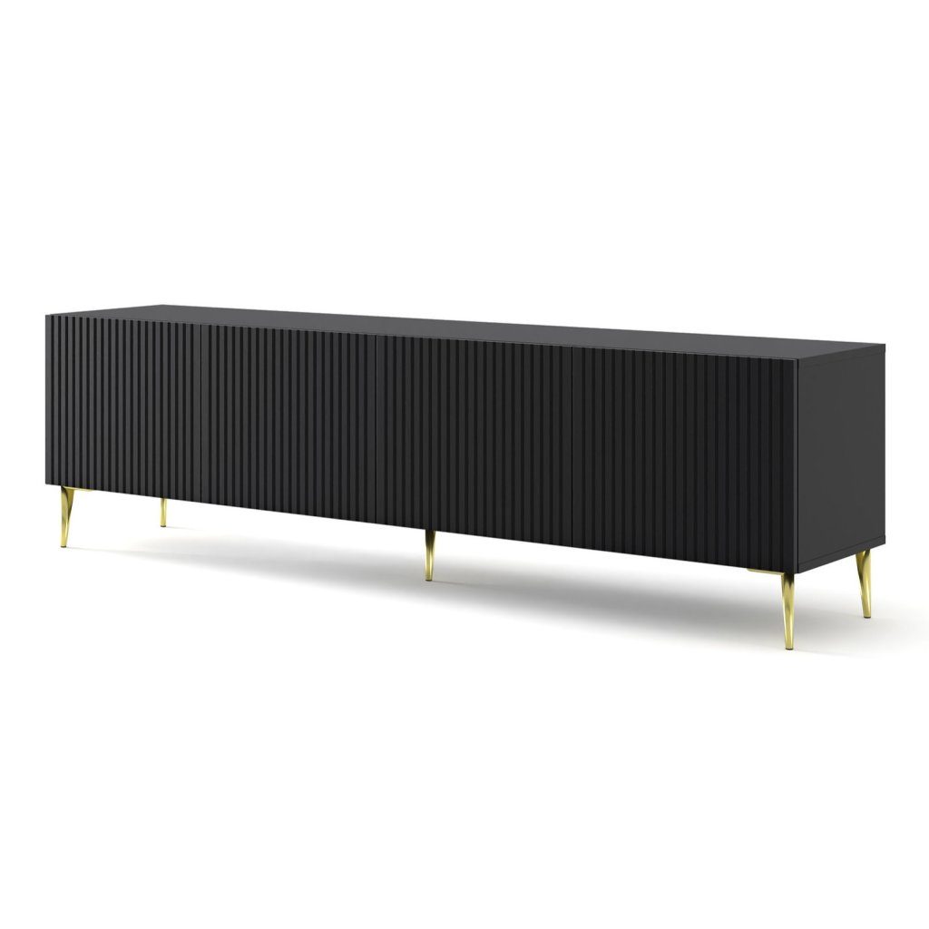 A modern TV-asztal RAVENNA B 4D 200 már a neve is jelzi, hogy egy gyönyörű , időtlen fekete matt színben készült bútorkollekció. A RAVENNA B TV asztal fogantyú nélküli mart előlapjai tökéletesen illeszkednek egymáshoz. A RAVENNA TV-asztal kialakítása , amely megfelel a legújabb trendeknek , fekete vagy arany színű lábakkal egészül ki. Az asztal tágas, négy ajtóval.