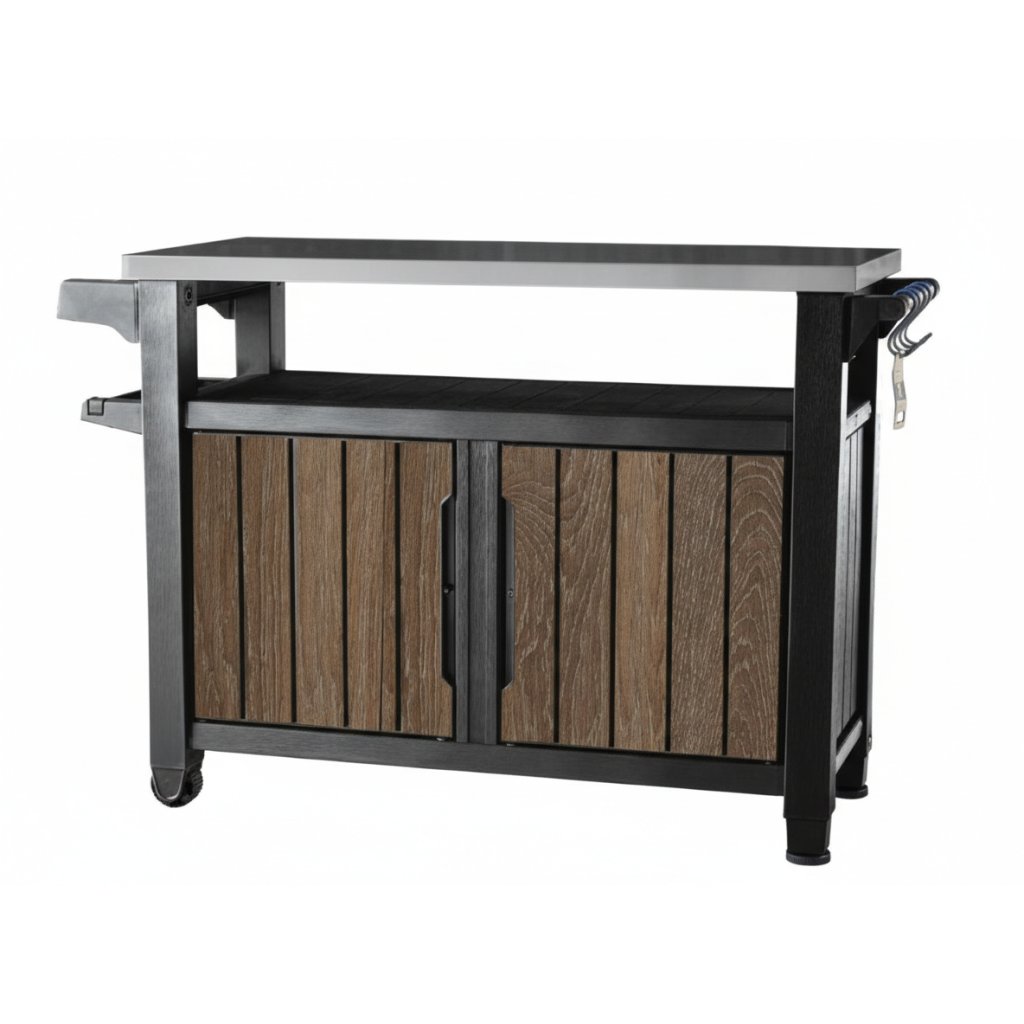 Csodálatos multifunkciós UNION XL 207L asztal dió színben, beépített szekrénnyel a szükséges dolgok tárolására, amit különösen grillezéskor fog értékelni. Tágas asztal Ajtóval, funkcionális táblával és praktikus, kampós fogantyúval felszerelve, nagyszerű segítő lesz családi grillezésekhez és kerti partikhoz.