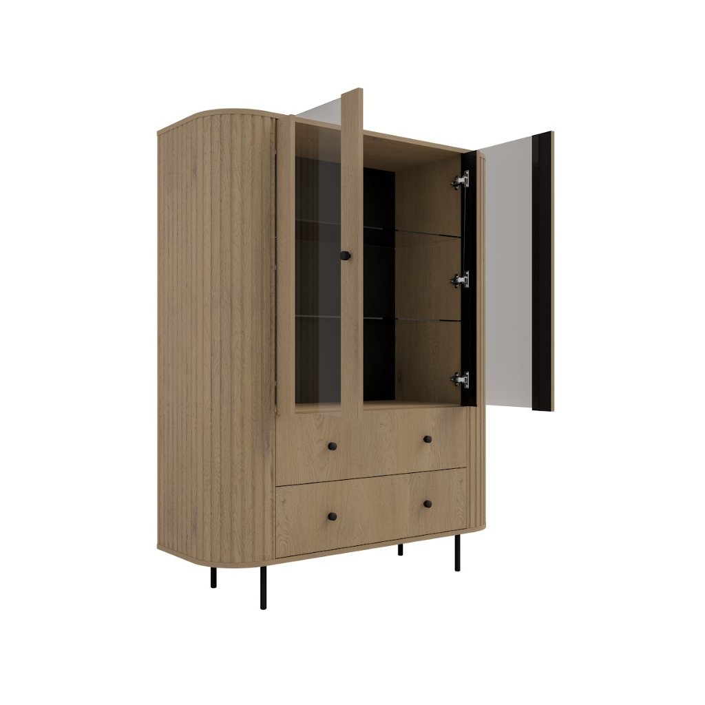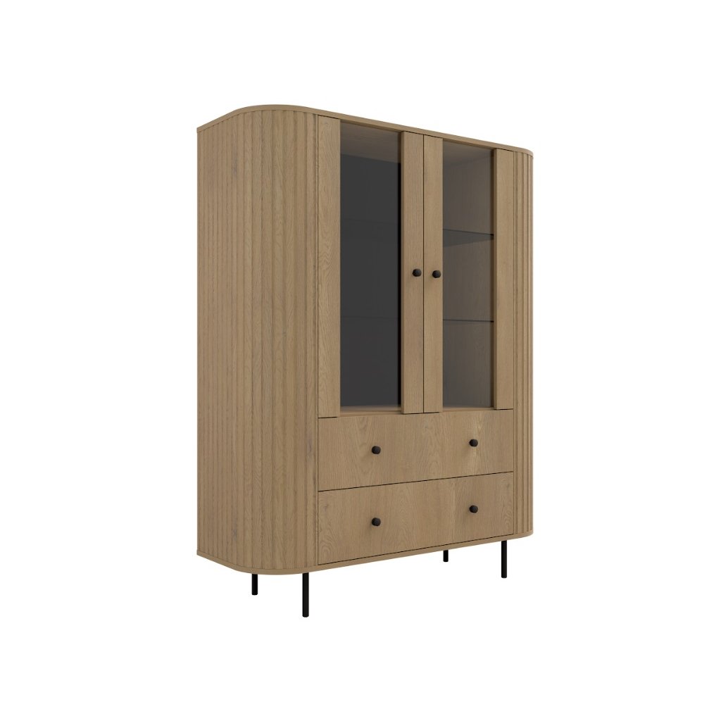 A VAOLIA kollekció minimalista stílust képvisel, melyet precízen megmunkált részletek és eredeti, lekerekített oldalak élénkítenek, új dimenziót adva az enteriőrnek. A színséma visszafogott, földszínű árnyalatokban , például cremonai tölgyben, fekete kiegészítők kombinációjában jelenik meg, amelyek finoman megzavarják a világos tónusokat. A VAOLIA 2F2S vitrin kétajtós, két tágas fiókkal. Az egyszerű fém lábak és fogantyúk , amelyek fekete színben kaphatók, könnyedséget és légiességet kölcsönöznek a vitrinnek anélkül, hogy vizuálisan megterhelnék.