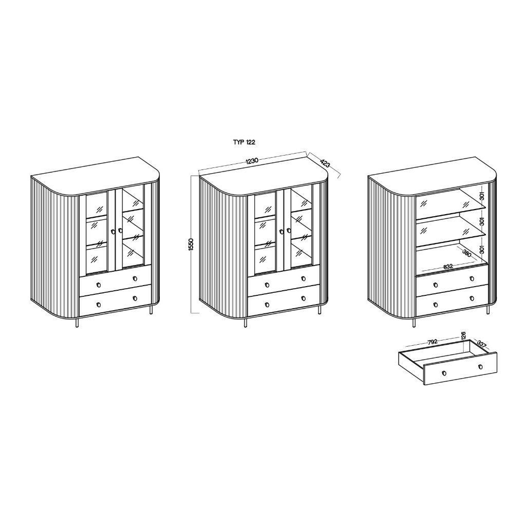 A VAOLIA vitrin laminált bútorlapból és 16 mm vastag MDF anyagból készült, ami nagy tartósságot és hosszú élettartamot garantál. A felületek masszívak, könnyen karbantarthatók és ellenállnak a mindennapi használatnak. A stabilitást és a modern megjelenést fém lábak és fogantyúk hangsúlyozzák. A nagyobb kényelem érdekében a bútor csendes záródású rendszerrel van felszerelve, amely biztosítja az ajtók és fiókok sima és csendes záródását. Tisztításhoz puha, vízzel enyhén megnedvesített kendőt vagy laminált felületekhez való, nem agresszív tisztítószert ajánlunk. Kerülje a súroló, kémiailag erős vagy alkohol alapú termékek használatát, amelyek károsíthatják a bútor felületét.