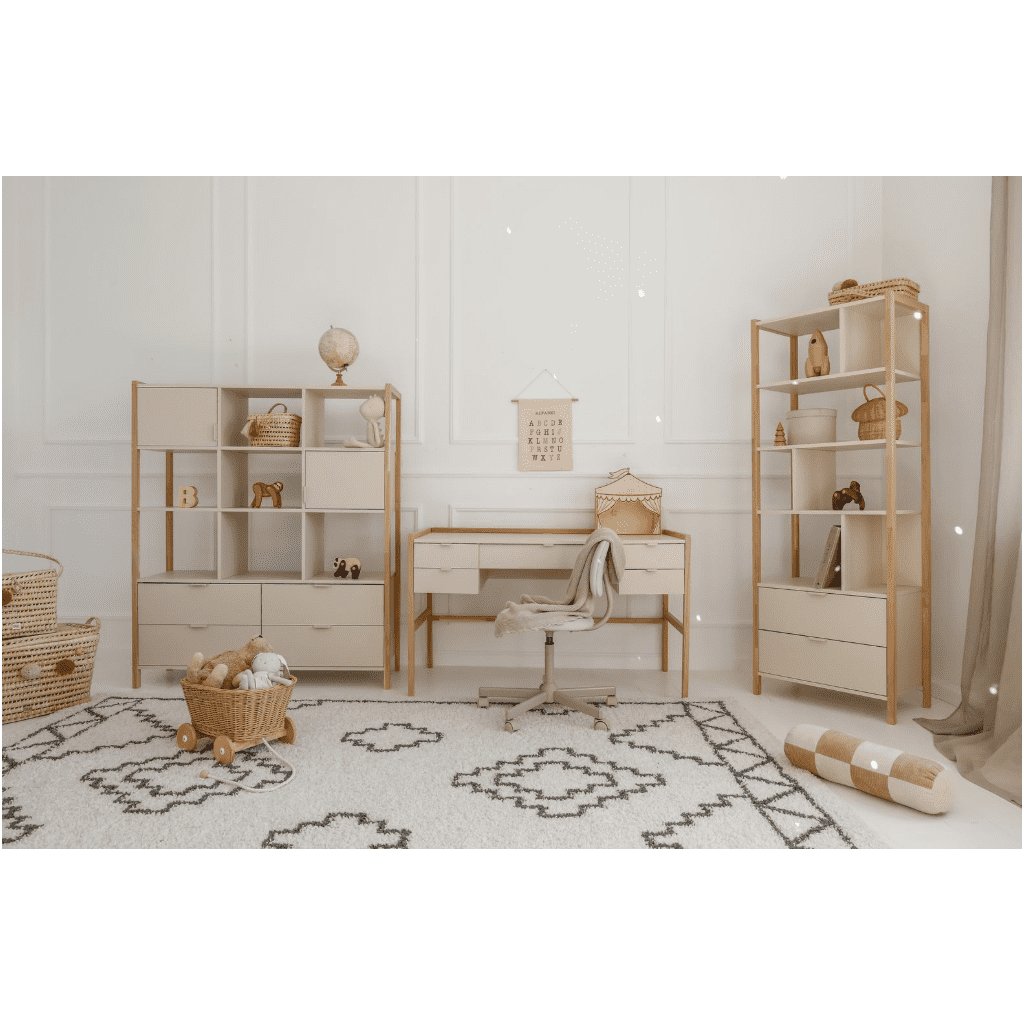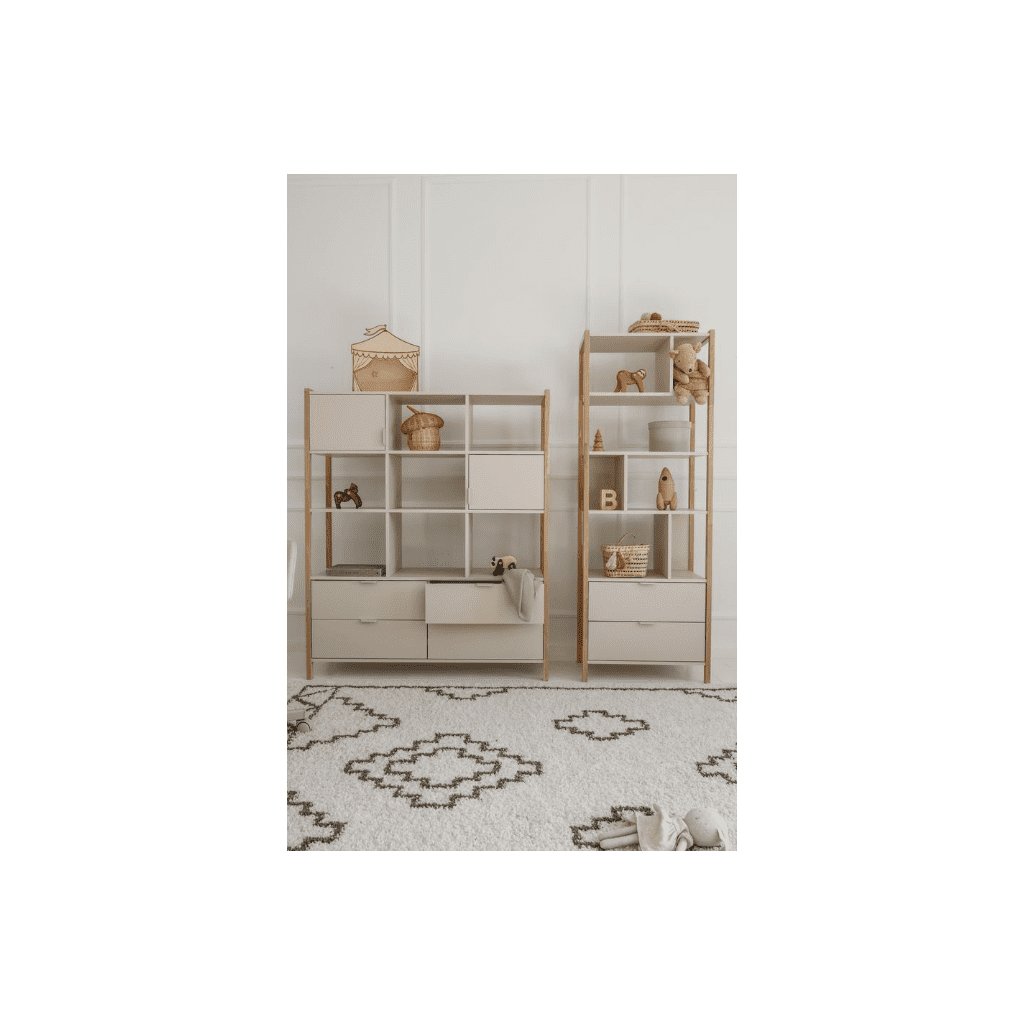 A praktikus és stílusos , alacsony és széles VERSA polc ideális kiegészítője lehet egy gyerekszobának és egy modern otthonnak. A világos latte árnyalat és a natúr fa kombinációjának köszönhetően friss, légies hatást kelt , ugyanakkor elegendő helyet biztosít tároláshoz és dekorációhoz. A polc két fiókkal, két ajtóval és három nyitott polccal rendelkezik. A VERSA polc segít egy letisztult és rendezett teret létrehozni , ahol minden kéznél lesz. Időtlen kialakításának köszönhetően nemcsak praktikus megoldás, hanem elegáns belső kiegészítő is. Válassza a széles VERSA polcot , és ötvözze a funkcionalitást a modern esztétikával.