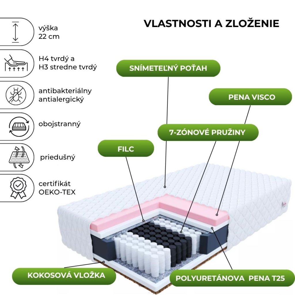 A VIGO modell VISCO hőre lágyuló habot használ, amely reagál a nyomásra és a testhőmérsékletre. Tökéletesen tükrözi a test alakját, és lehetővé teszi, hogy a gerinc természetes görbületet vegyen fel alvás közben. Az egyik oldalon használt kókusz betét ráadásul megkeményíti az egyik használható felületet, gomba- és allergiaellenes tulajdonságokkal rendelkezik. A kókusz jól átengedi a levegőt, így a penészgombák, gombák és egyéb mikroorganizmusok gyors szaporodása jelentősen lelassul.