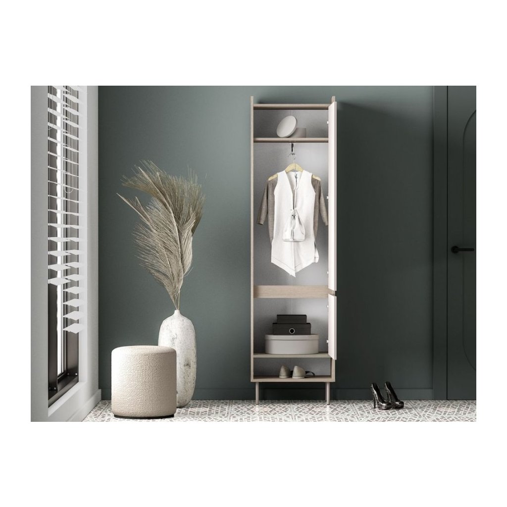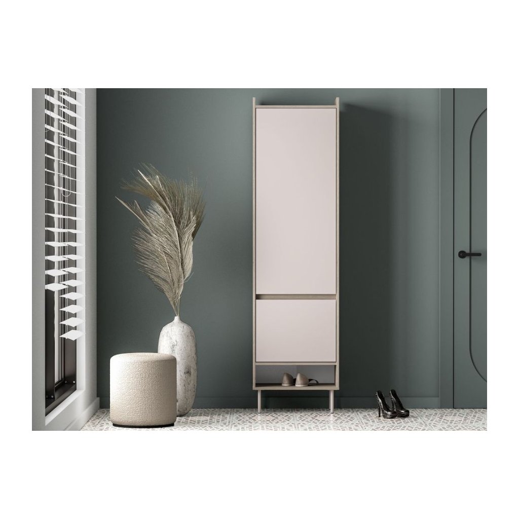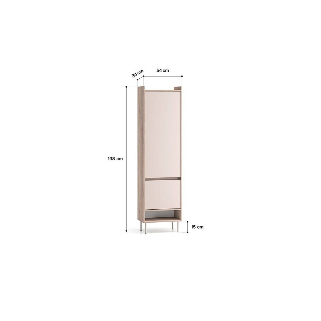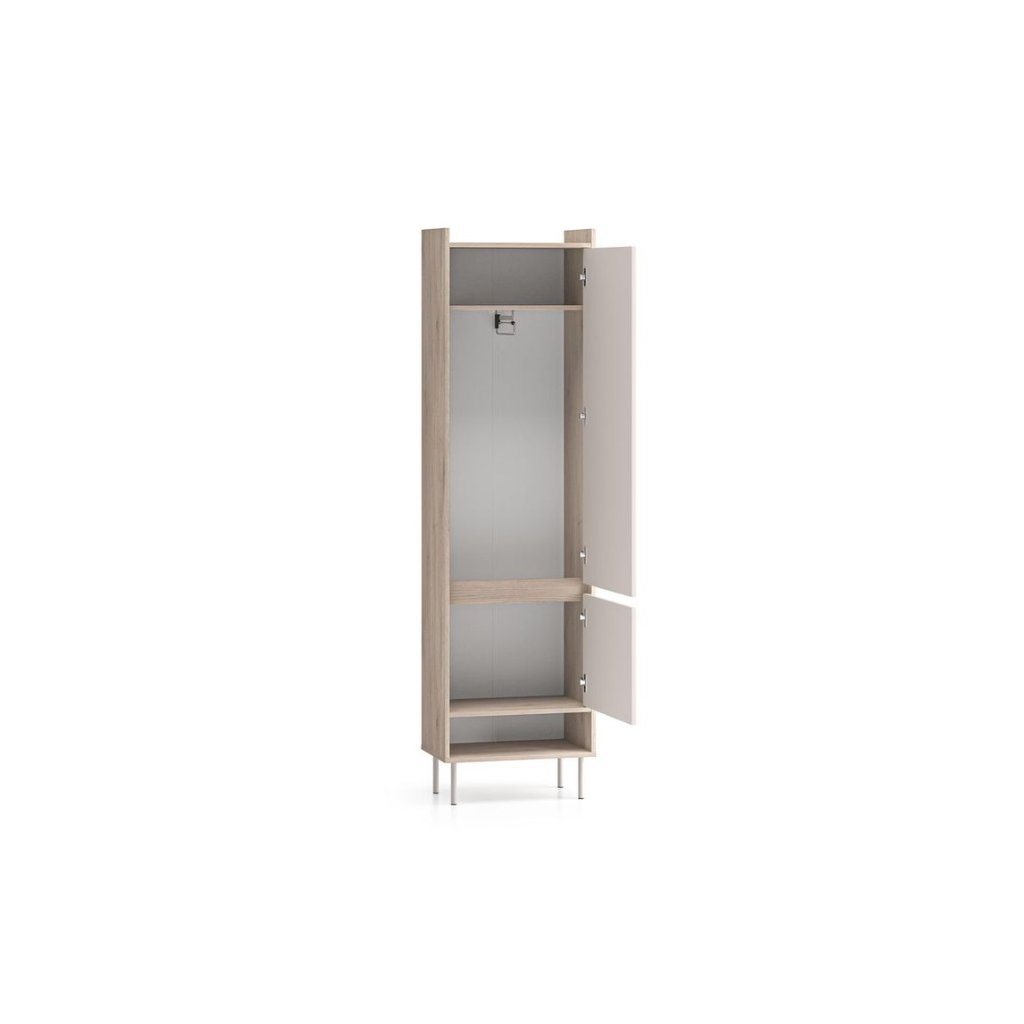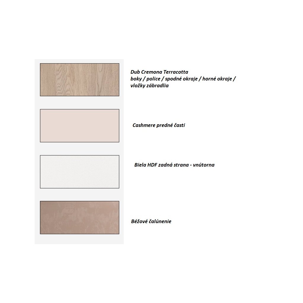 A VOIR 01 gardróbszekrény puha kasmír és elegáns cremonai terrakotta tölgy színkombinációja ideális kombinációt alkot, amely illeszkedik a modern enteriőrökbe. A fogantyú nélküli frontok minimalista jelleget kölcsönöznek az egyes elemeknek, az egyszerű fém lábak pedig hangsúlyozzák könnyedségüket , ugyanakkor megkönnyítik a hatékony tisztítást. A bútorok magas funkcionalitása biztosítja a kényelmes használatot minden nap. A gardróbszekrény tágas, polccal és ruhaakasztó rúddal rendelkezik.