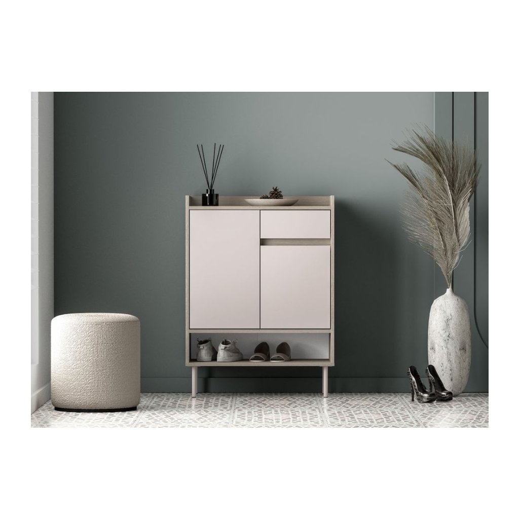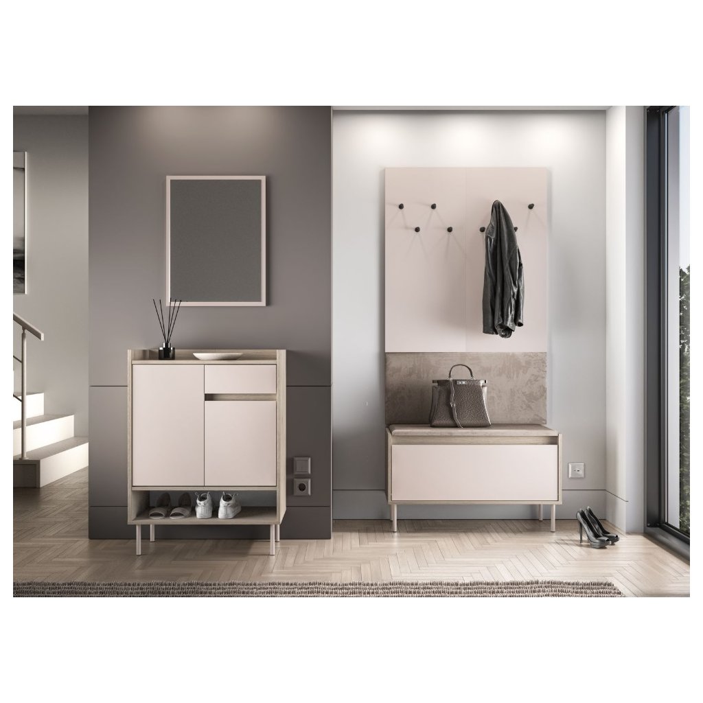 A VOIR előszoba puha kasmír és elegáns cremonai terrakotta tölgy színkombinációja ideális kombinációt alkot, amely illeszkedik a modern belső terekbe. A fogantyú nélküli frontok minimalista jelleget kölcsönöznek az egyes elemeknek, az egyszerű fém lábak pedig hangsúlyozzák könnyedségüket , ugyanakkor megkönnyítik a hatékony tisztítást. Az előszoba magas funkcionalitása biztosítja a kényelmes használatot minden nap.